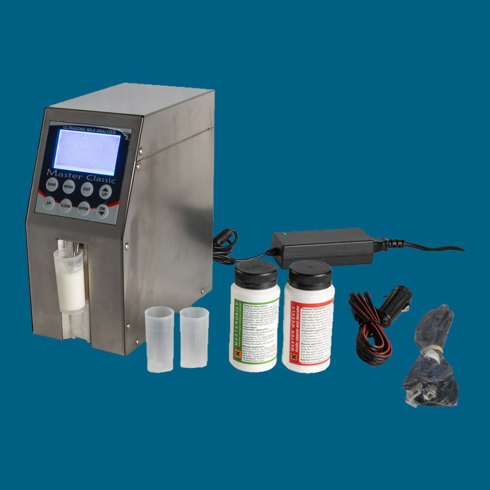 Rapid laboratory analyzer calibrated for cream ok milk, pasteurized and raw cow milk. Parameters measured: fat, protein, density, freezing point, lactose, salt content, wetting. Supplied with mains adapter and USB cable, 1 bottle of alkaline cleaning solution, 1 bottle of acid cleaning solution, 1 CD with data collection program. Power supply 230 V. 50 Hz.