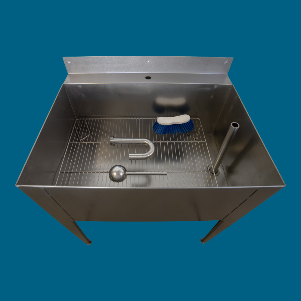 Washing sink in stainless steel. Suitable for racks or grids 630 mm x 510 mm. Interior dimensions: 930 mm x 610 mm. Sink depth: 400 mm, overall height 1000 mm. Includes bung and overflow. Adjustable stainless steel feet.