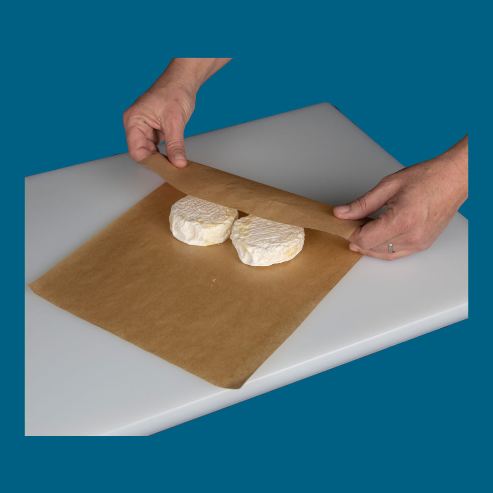 Brown kraft wrapping paper, 50g/m² (cheese side glossy). Dimensions: 32 cm x 50 cm. Ideal for semi-fresh, dry and mature cheese. Sold in packs of 10 kg. Price per kilo.