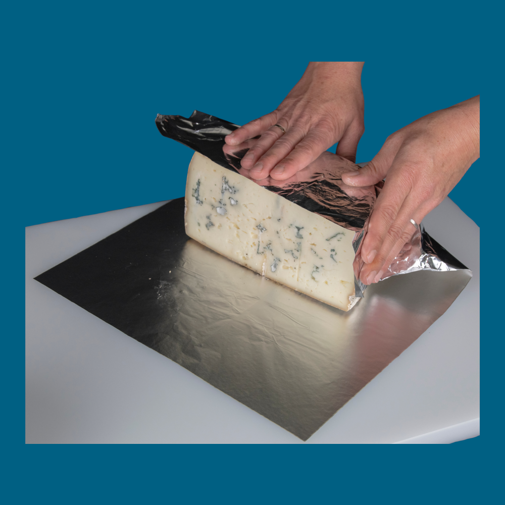 Embalaje hoja de aluminio de 12 µ para envolver quesos azules. Dimensiones: 320 mm x 440 mm. Se vende en paquetes de 1000 hojas. Precio por paquete.
