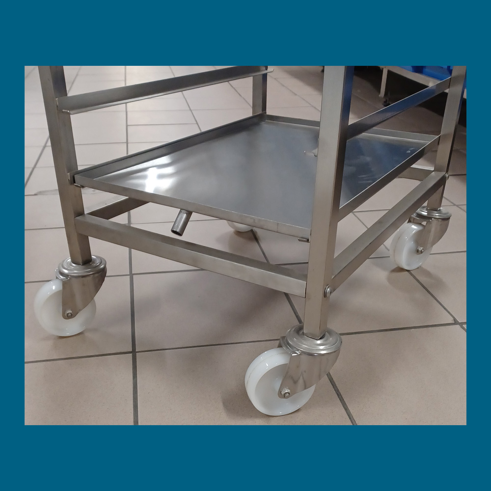 Placa de acero inoxidable que permite la recuperación del suero en la base del carro durante el desuerado. Reborde 15 mm. Tuvo de evacuación longitud 30 mm. Dimensiones: 600 x 400 mm.