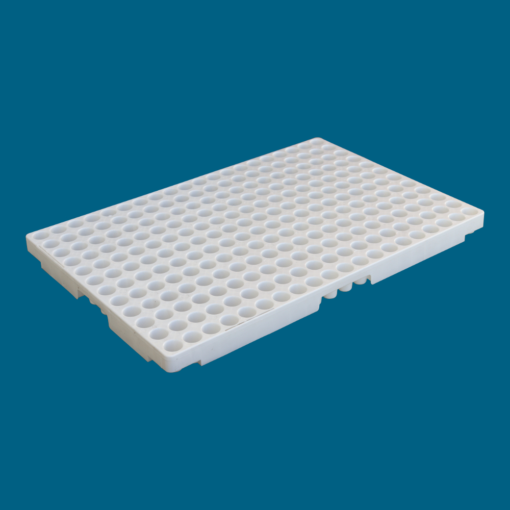 Pour le moulage de fromages apéritifs coniques. Diamètre supérieur du cône 25 mm. Dimensions de la plaque 600 mm x 400 mm, épaisseur 36 mm, 240 trous. Peut être utilisé avec une ceinture de moulage réf 060CAB.