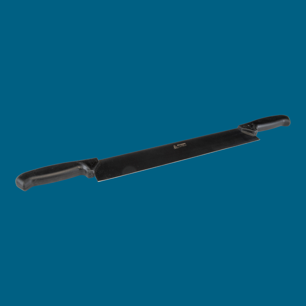 Couteau à fromage à deux poignées, pour découpe à 2 mains, pour les pâtes dures, pâtes cuites, tommes. Poignées noires en polypropylène. Lame inoxydable. Longueur de lame 36 cm. Longueur totale 61.5 cm.