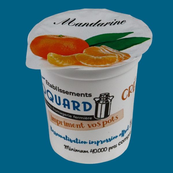 Opercule imprimée en aluminium avec photo de fruits en couleur pour yaourt aromatisé ou aux fruits, pour pot plastique en polystyrène et en polypropylène. Dimension : 68 mm. Parfum : mandarine. Blister de 2000. Prix pour 1000 opercules.