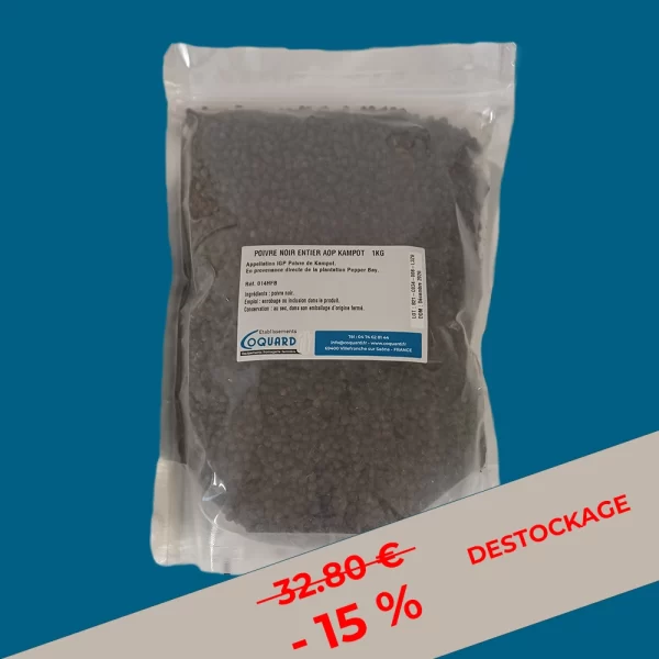 Poivre noir entier de KAMPOT. Poivre d'excellence en provenance directe de la plantation PEPPER BAY au Cambodge. Prix au sachet de 1 kg. Tarif dégressif à partir de 5 sachets.