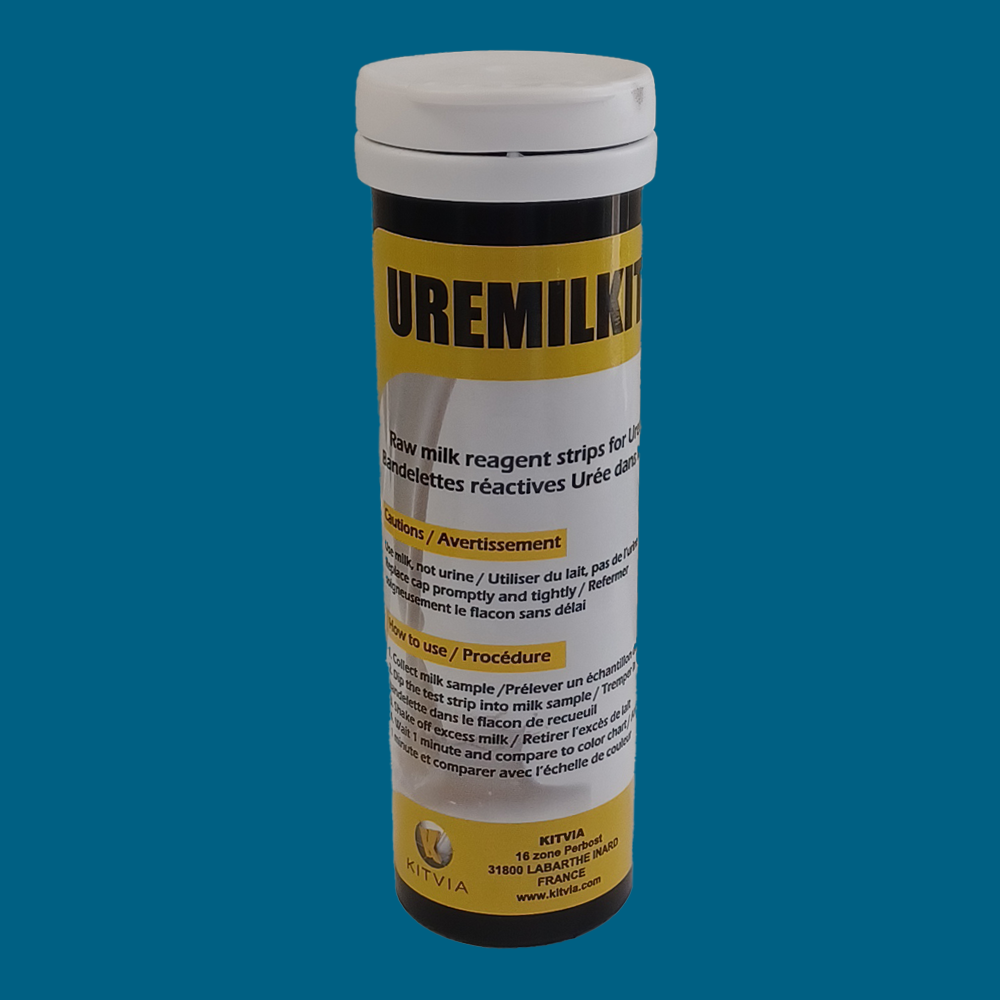Boîte de 25 tests pour contrôle du taux d'urée dans le lait. Lecture après 60 secondes. Vendu par boîte de 25 tests. La bandelette se colore plus ou moins verte. L'urée est un inhibiteur pour les ferments. En chèvre en particulier, le risque d'accident de fromagerie commence dès que le taux d'urée atteint 600 mg/l.